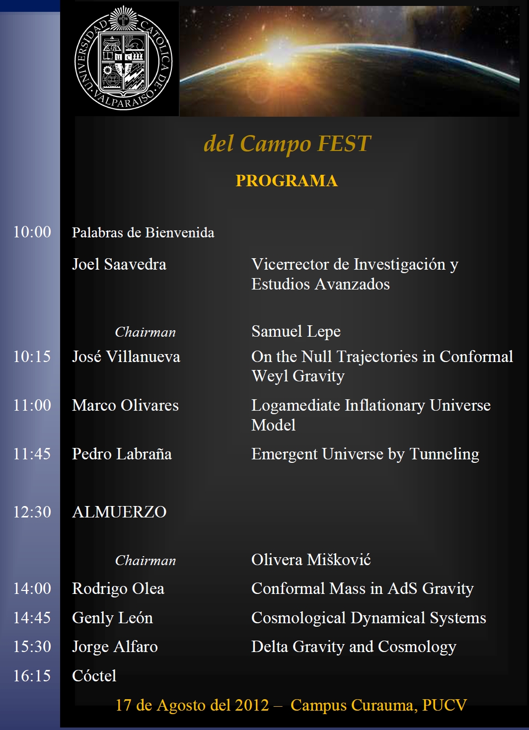 Este evento tiene como finalidad celebrar el cumpleaños Nº60 del profesor Dr. Sergio del Campo Araya, realizando así un reconocimiento a su gran labor como científico y formador de físicos en nuestro país. Cabe señalar que el Dr. Del Campo es el primer cosmólogo teórico de Chile y fundador de esta línea de Investigación.