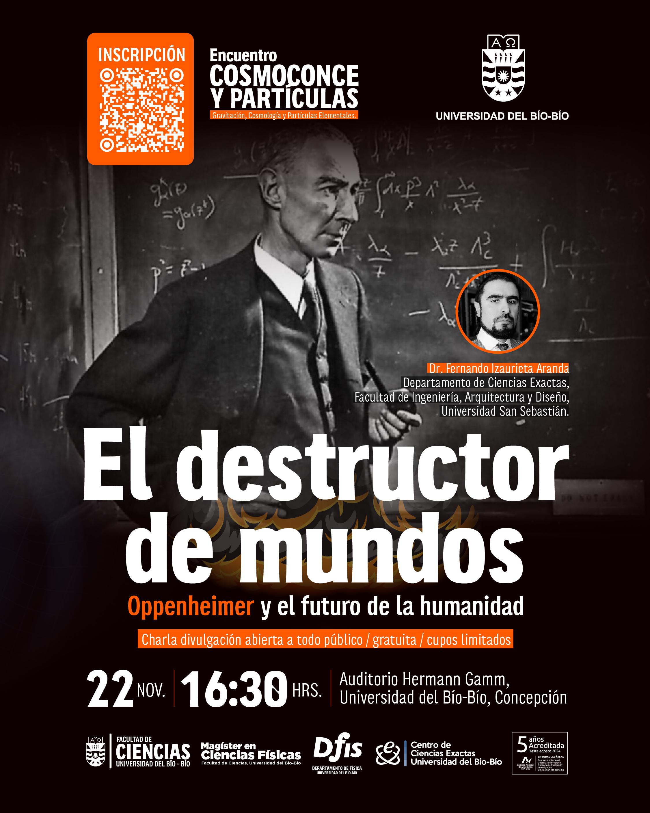 El Dr. Fernando  Izaurieta brindará una conferencia titulada «El destructor de mundos: Oppenheimer y el futuro de la humanidad», como parte del  Encuentro COSMOCONCE y PARTÍCULAS 2023. La actividad es de carácter gratuito, abierta a todo público y se realizará el día miércoles 22 de noviembre a las 16:30 hrs. en el auditorio Hermann Gamm, ubicado en el segundo piso Edificio Gantes, en la Universidad del Bío-Bío, sede Concepción.