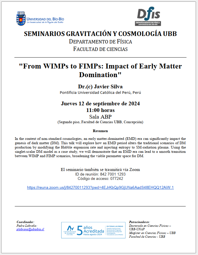 Coordenadas: Jueves 12 de septiembre, 11:00  horas, Sala ABP (Segundo piso, Facultad de Ciencias UBB, Concepción).