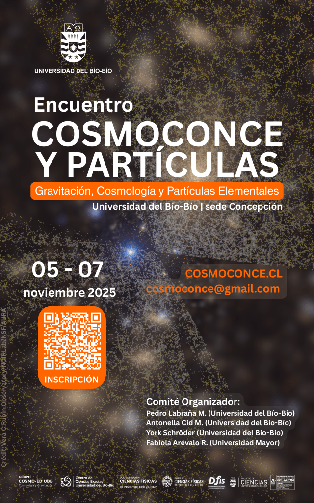 Tenemos el agrado de invitarle a participar en el Encuentro COSMOCONCE Y PARTÍCULAS 2025, el cual se realizará del 5 al 7 de noviembre de 2025 en la Facultad de Ciencias de la Universidad del Bío-Bío, campus Concepción, Chile. El encuentro es organizado por el Grupo de Cosmología y Gravitación UBB y el Centro de Ciencias Exactas UBB, y tiene como objetivo la discusión e intercambio de ideas en diversos tópicos de gravitación, cosmología, altas energías y partículas elementales.