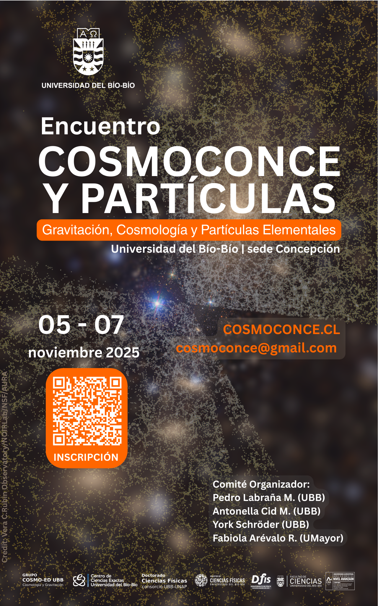 Tenemos el agrado de invitarle a participar en el Encuentro COSMOCONCE Y PARTÍCULAS 2025, el cual se realizará del 5 al 7 de noviembre de 2025 en la Universidad del Bío-Bío, campus Concepción, Chile. El encuentro es organizado por el Grupo de Cosmología y Gravitación UBB y el Centro de Ciencias Exactas UBB, y tiene como objetivo la discusión e intercambio de ideas en diversos tópicos de gravitación, cosmología, altas energías y partículas elementales.